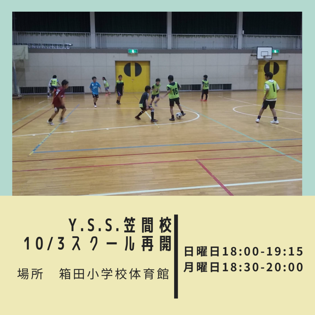 10/3よりスクール再開 投稿日時: 2021年9月30日 投稿者: yss2011 10月3日よりY.S.S.笠間校のスクールが再開します。 日時 日曜日 18:00-19:15 月曜日 18:30-20:00 場所 箱田小学校体育館 【Y.S.S.笠間校サッカースクール】