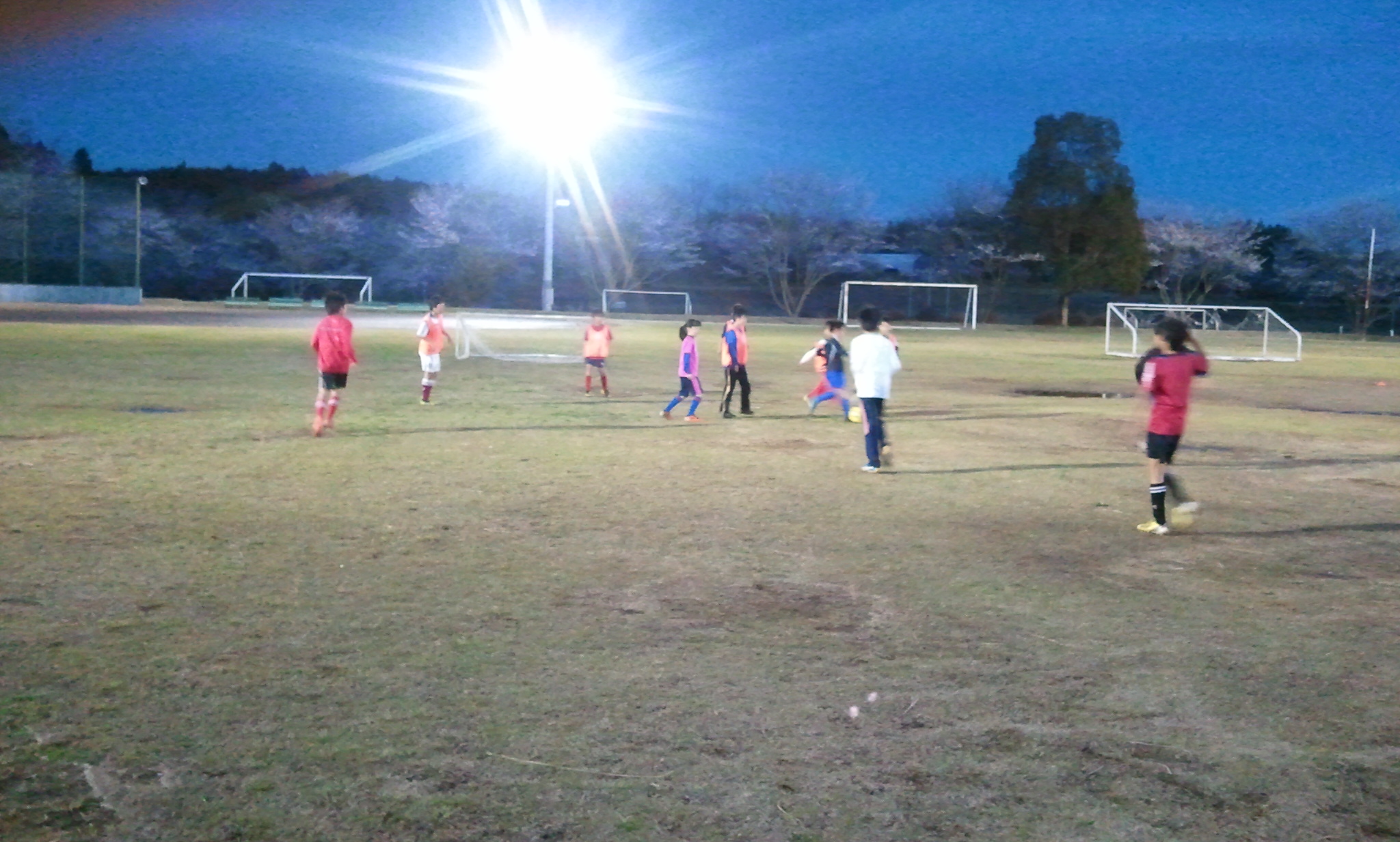 でも実際に練習を行うには水溜りも多くて通常通りにとまではいかなかったので、今日は水はけの良い場所を選んでドリブル練習を行いました。こうしたドリル 形式のトレーニングは半年くらい前に嫌って言うほど行ったもので、その難易度をあげて新年度1回目の練習にしました。大切にしてもらいたかったのは「ボー ルを置く場所」で、シュートを打とうとするのになんどもボールの置く場所を修正するのではなく、スピードを上げてもそのままの勢いでシュートを打てる、そういうイメージを植えつけようと今回試みました。