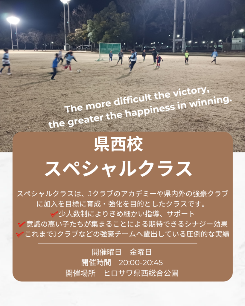 スペシャルクラスは、Jクラブのアカデミーや県内外の強豪クラブへの加入を目標にした選手のための、選抜型育成・強化クラスです。このクラスでは、「技術」や「戦術理解」はもちろんのこと、次のステージで求められる思考力・判断力・個性を磨き、試合で結果を残せる選手の育成を徹底しています。